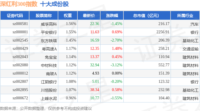 证券之星消息,11月10日,深红利300(970062)指数报收于5705.38点,涨0.38%,成交2134.83亿元,换手率2.06%。当日该指数成份股中,上涨的有195家,欢乐家以19.98%的涨幅领涨,下跌的有103家,良信股份以10.03%的跌幅领跌。