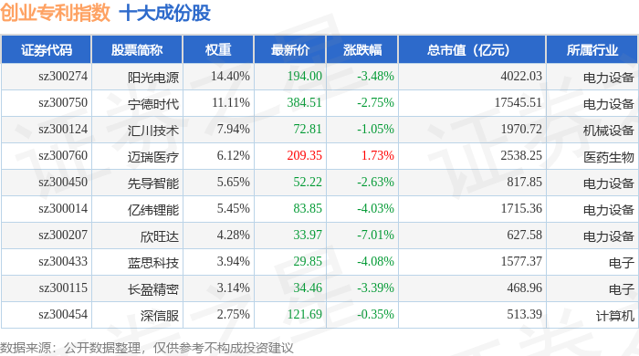 创业专利(970068)指数十大成份股详情如下:
