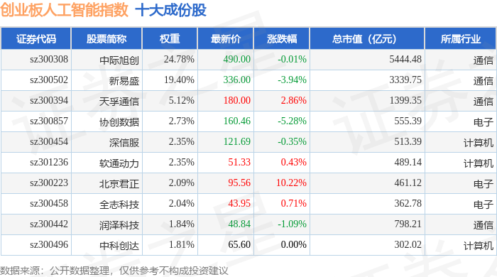 证券之星消息,11月10日,创业板人工智能(970070)指数报收于5204.54点,跌0.38%,成交830.93亿元,换手率4.72%。当日该指数成份股中,上涨的有30家,北京君正以10.22%的涨幅领涨,下跌的有19家,协创数据以5.28%的跌幅领跌。