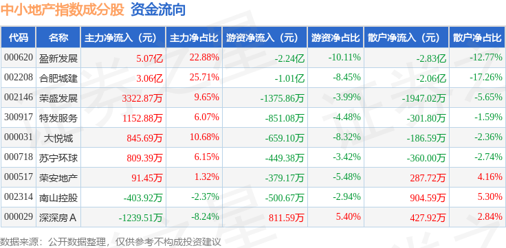 资金流向方面,中小地产(971002)指数成份股当日主力资金净流入合计8.59亿元,游资资金净流出合计3.59亿元,散户资金净流出合计5.0亿元。成份股资金流向详情见下表: