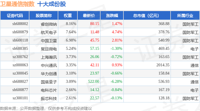 卫星通信(980018)指数十大成份股详情如下: