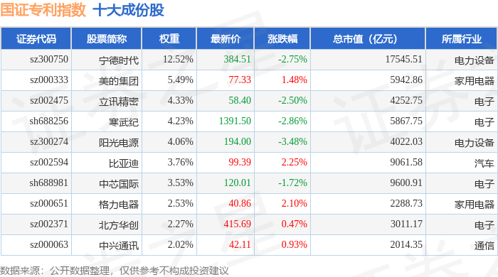 证券之星消息,11月10日,国证专利(980070)指数报收于3716.25点,跌0.65%,成交2001.57亿元,换手率1.4%。当日该指数成份股中,上涨的有54家,东方电气以7.68%的涨幅领涨,下跌的有44家,欣旺达以7.01%的跌幅领跌。