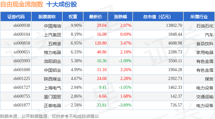 证券之星消息,11月10日,自由现金流(980092)指数报收于5443.44点,涨1.11%,成交823.65亿元,换手率2.37%。当日该指数成份股中,上涨的有72家,首旅酒店以10.01%的涨幅领涨,下跌的有25家,大洋电机以4.31%的跌幅领跌。