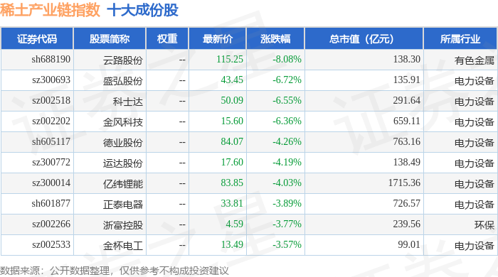 证券之星消息,11月10日,稀土产业链(989013)指数报收于3867.33点,跌1.45%,成交1154.49亿元,换手率3.32%。当日该指数成份股中,上涨的有19家,明阳电气以5.48%的涨幅领涨,下跌的有31家,云路股份以8.08%的跌幅领跌。