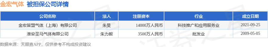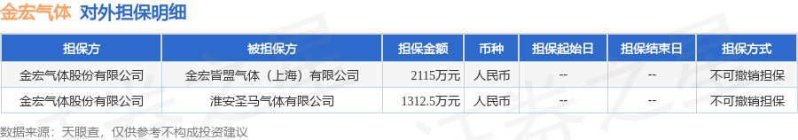 金宏气体11月7日披露2笔对外担保,被担保公司2家。对外担保明细如下表:
