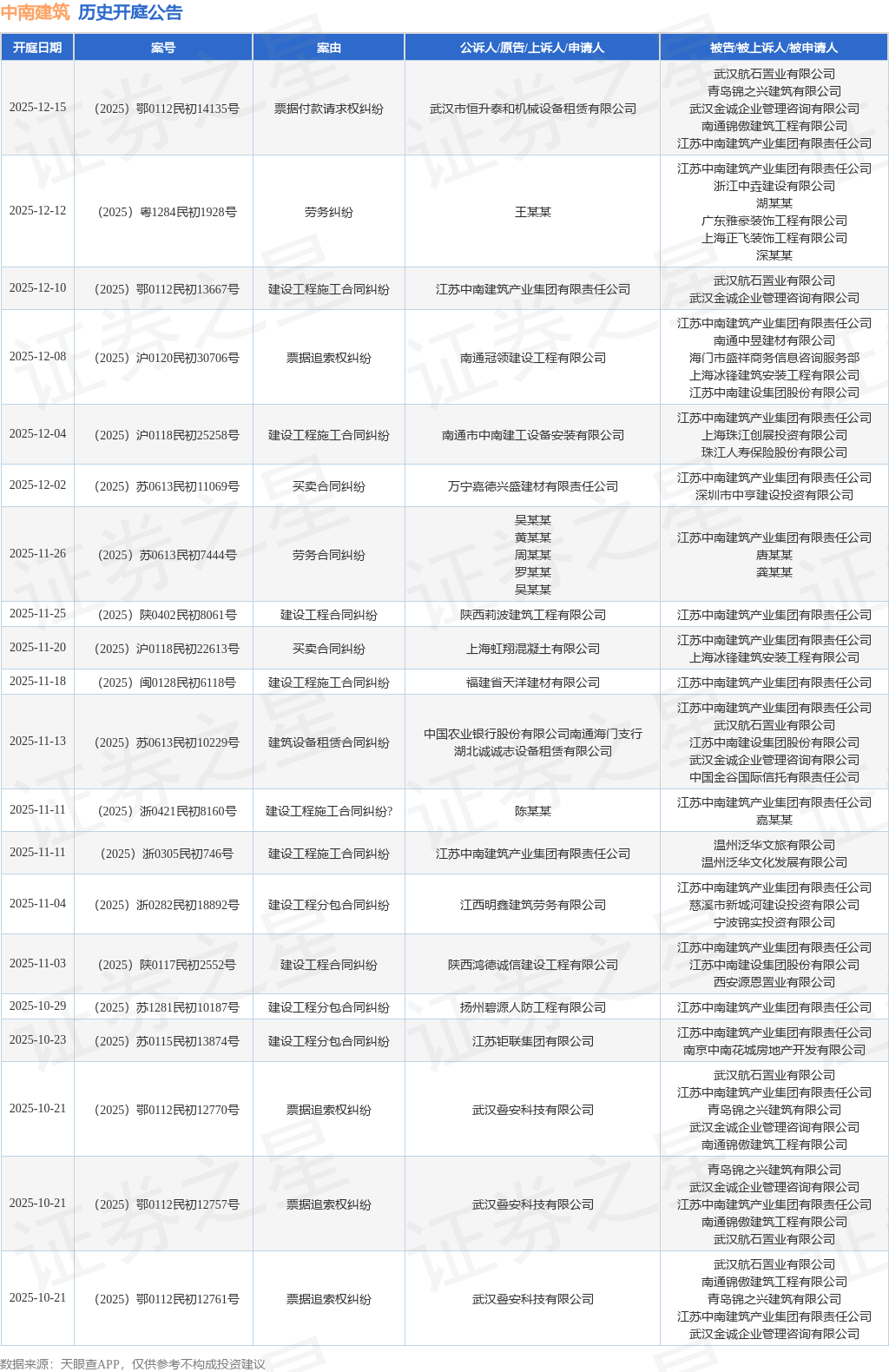 案号:(2025)苏0613民初10229号根据统计,近一年内以江苏中南建筑产业集团有限责任公司为当事人的历史开庭公告有630则,其中案由为“买卖合同纠纷”的公告以118则居首,其次为“建设工程分包合同纠纷”有97则,“建设工程施工合同纠纷”有83则。历史开庭公告(前20条)如下: