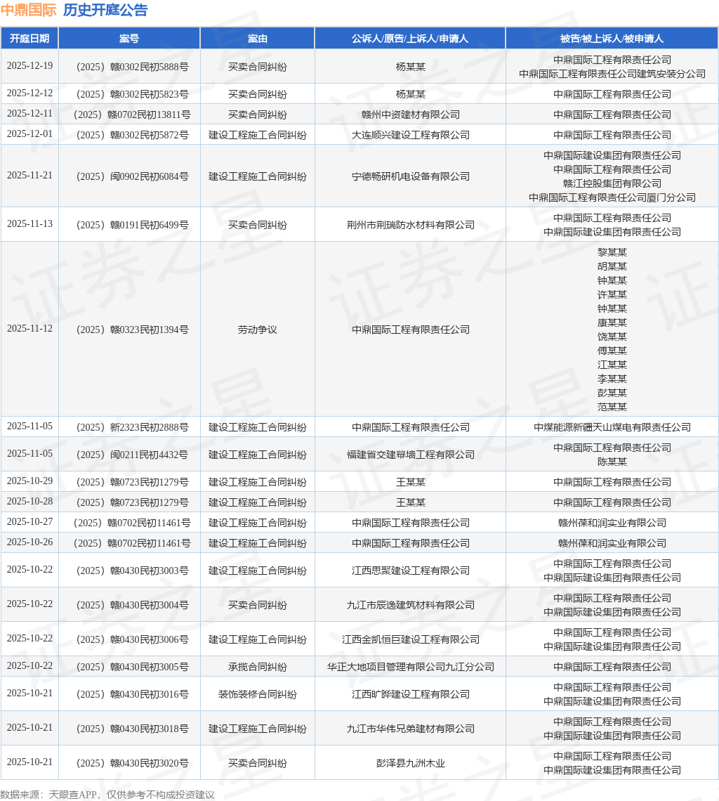 案号:(2025)赣0191民初6499号根据统计,近一年内以中鼎国际工程有限责任公司为当事人的历史开庭公告有116则,其中案由为“买卖合同纠纷”的公告以26则居首,其次为“建设工程施工合同纠纷”有26则,“劳务合同纠纷”有24则。历史开庭公告(前20条)如下:
