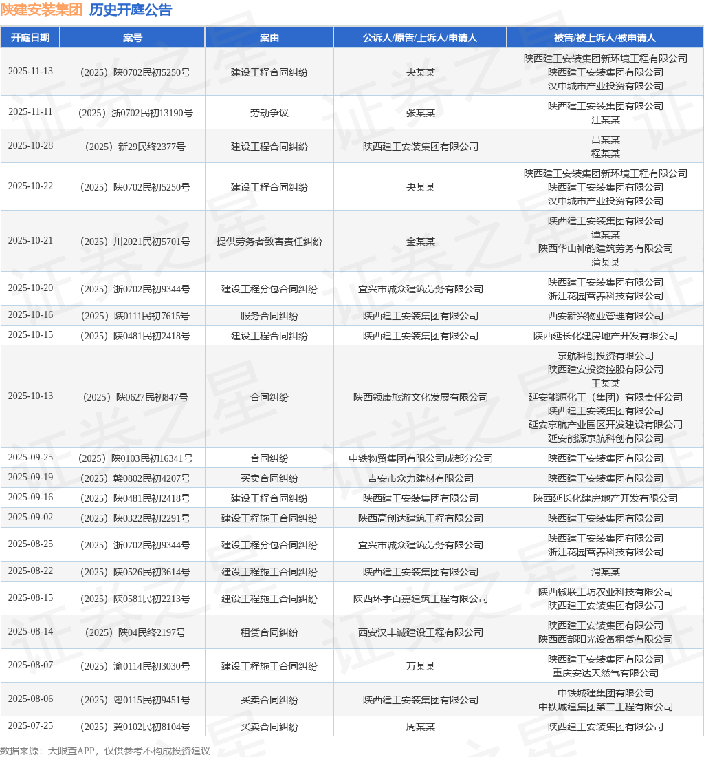 案号:(2025)陕0702民初5250号根据统计,近一年内以陕西建工安装集团有限公司为当事人的历史开庭公告有113则,其中案由为“建设工程施工合同纠纷”的公告以28则居首,其次为“买卖合同纠纷”有16则,“建设工程分包合同纠纷”有15则。历史开庭公告(前20条)如下: