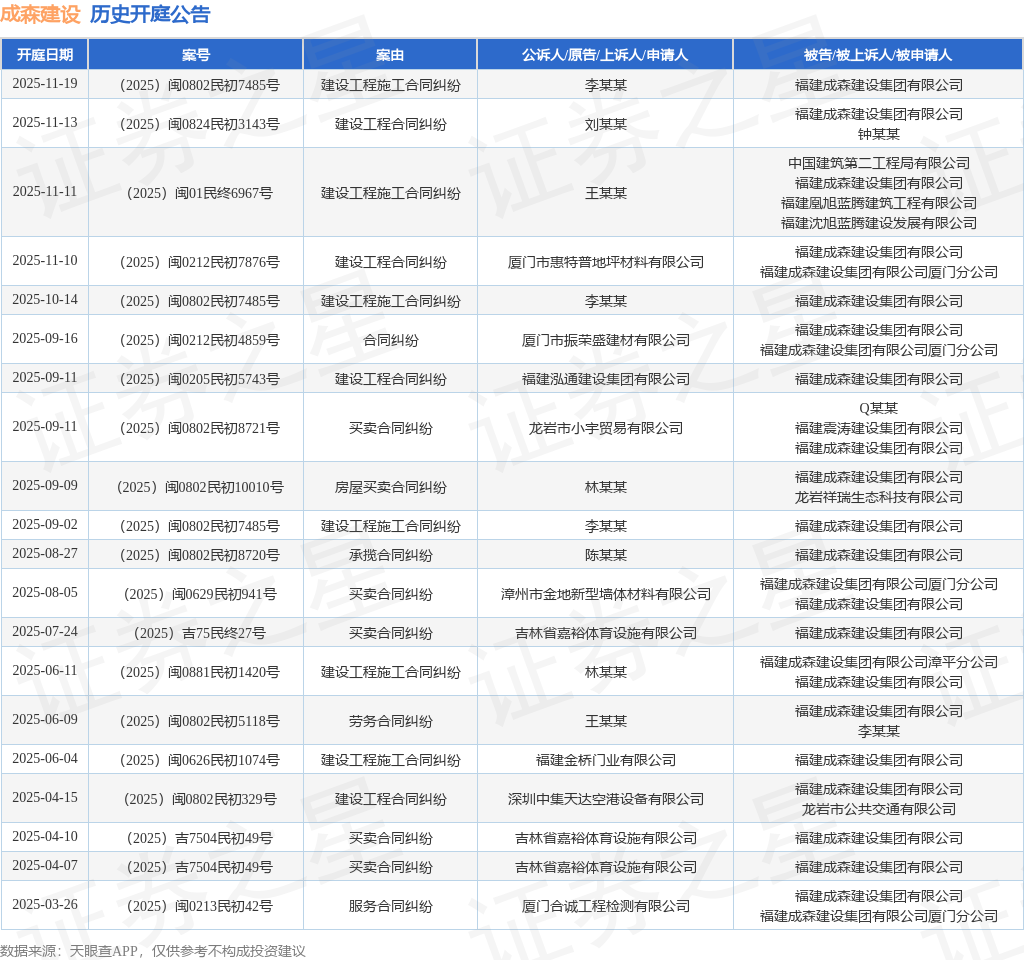案号:(2025)闽0824民初3143号根据统计,近一年内以福建成森建设集团有限公司为当事人的历史开庭公告有28则,其中案由为“建设工程施工合同纠纷”的公告以7则居首,其次为“买卖合同纠纷”有5则,“建设工程合同纠纷”有5则。历史开庭公告(前20条)如下: