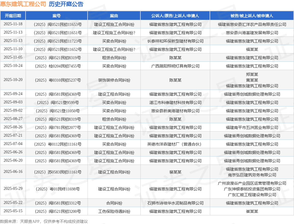 案号:(2025)闽0521民初11723号根据统计,近一年内以福建省惠东建筑工程有限公司为当事人的历史开庭公告有54则,其中案由为“买卖合同纠纷”的公告以14则居首,其次为“建设工程施工合同纠纷”有13则,“建设工程合同纠纷”有5则。历史开庭公告(前20条)如下: