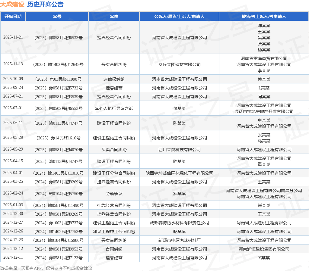 案号:(2025)豫1402民初12645号根据统计,近一年内以河南省大成建设工程有限公司为当事人的历史开庭公告有32则,其中案由为“挂靠经营合同纠纷”的公告以8则居首,其次为“建设工程施工合同纠纷”有5则,“买卖合同纠纷”有4则。历史开庭公告(前20条)如下: