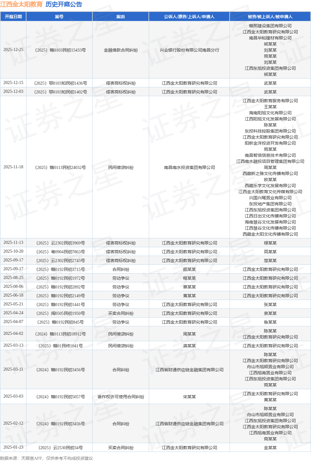 案号:(2025)云2302民初3969号根据统计,近一年内以江西金太阳教育研究有限公司为当事人的历史开庭公告有23则,其中案由为“侵害商标权纠纷”的公告以5则居首,其次为“劳动争议”有5则,“民间借贷纠纷”有4则。历史开庭公告(前20条)如下: