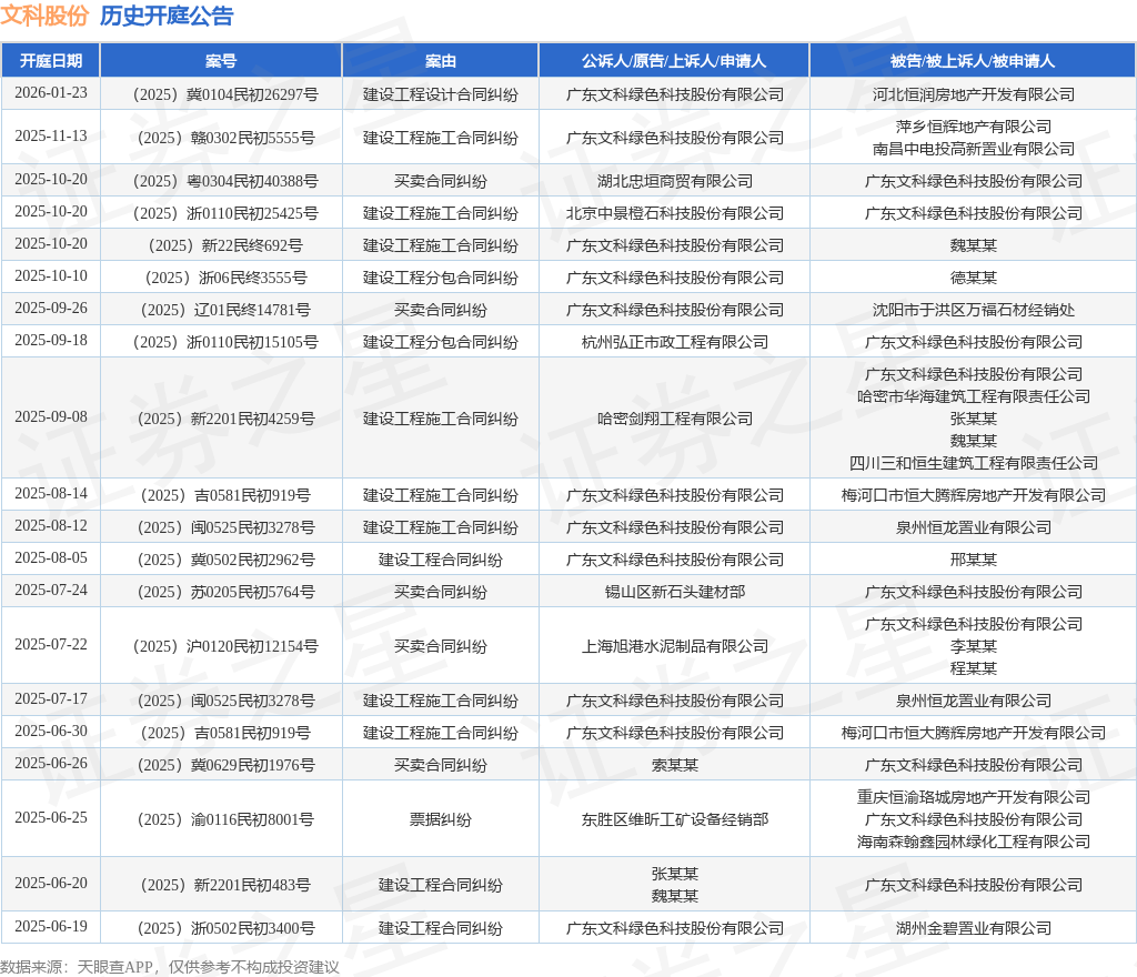 案号:(2025)赣0302民初5555号根据统计,近一年内以广东文科绿色科技股份有限公司为当事人的历史开庭公告有110则,其中案由为“建设工程施工合同纠纷”的公告以37则居首,其次为“劳务合同纠纷”有15则,“买卖合同纠纷”有14则。历史开庭公告(前20条)如下: