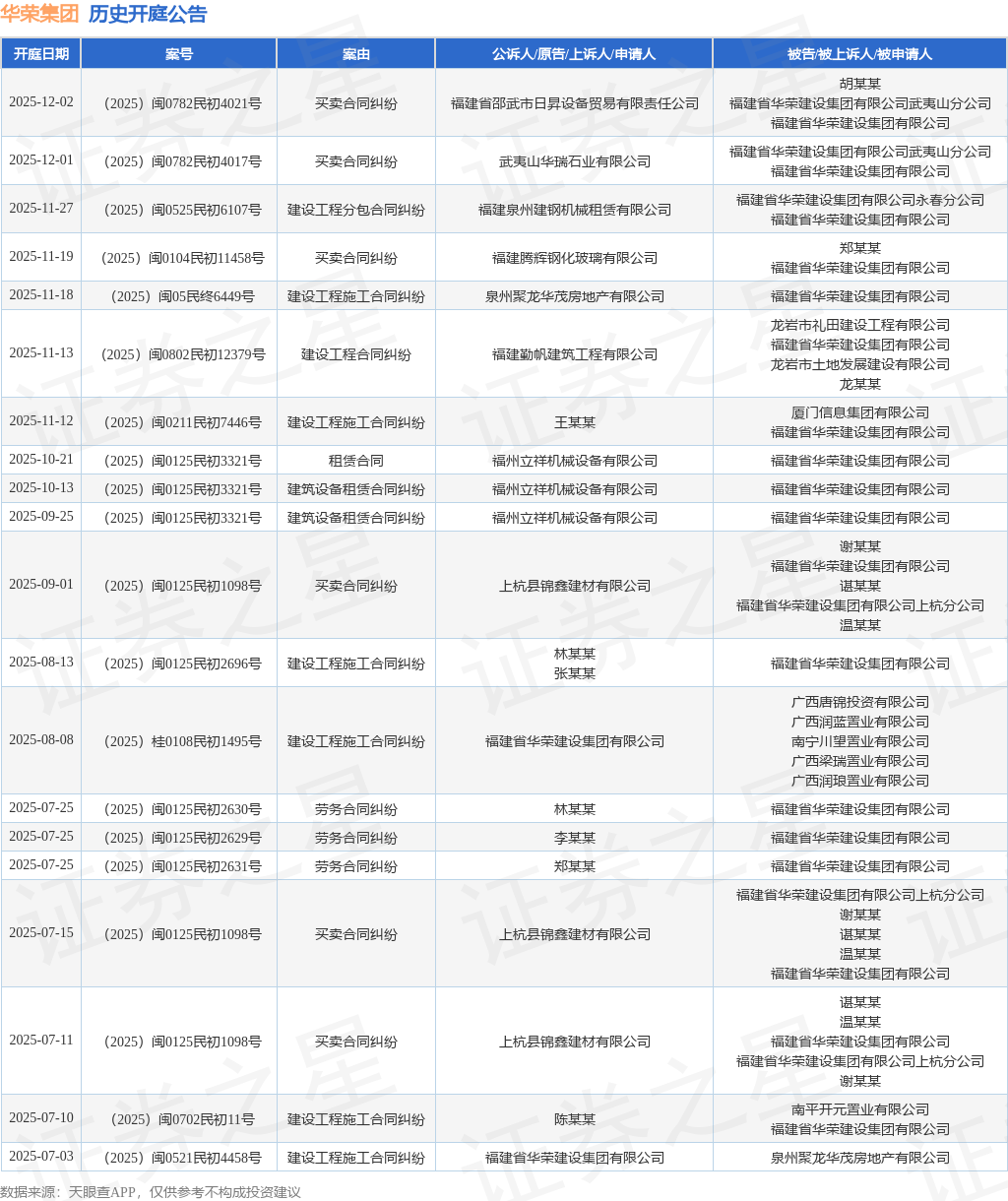 案号:(2025)闽0802民初12379号根据统计,近一年内以福建省华荣建设集团有限公司为当事人的历史开庭公告有69则,其中案由为“建设工程施工合同纠纷”的公告以27则居首,其次为“买卖合同纠纷”有20则,“建设工程分包合同纠纷”有5则。历史开庭公告(前20条)如下:
