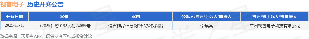 证券之星消息,根据天眼查APP显示,近日公布了一则广州视睿电子科技有限公司作为被告/被上诉人的开庭公告,详细内容如下: