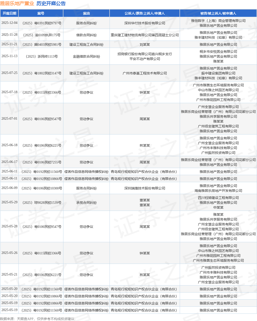 案号:(2025)浙民终1113号根据统计,近一年内以雅居乐地产置业有限公司为当事人的历史开庭公告有44则,其中案由为“劳动争议”的公告以12则居首,其次为“侵害作品信息网络传播权纠纷”有6则,“股权转让纠纷”有4则。历史开庭公告(前20条)如下: