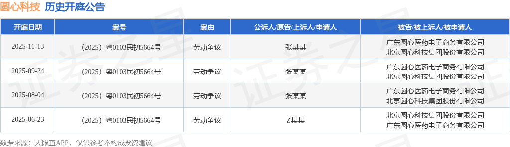 根据统计,近一年内以北京圆心科技集团股份有限公司为当事人的历史开庭公告有4则,其中案由为“劳动争议”的公告以4则居首。历史开庭公告如下: