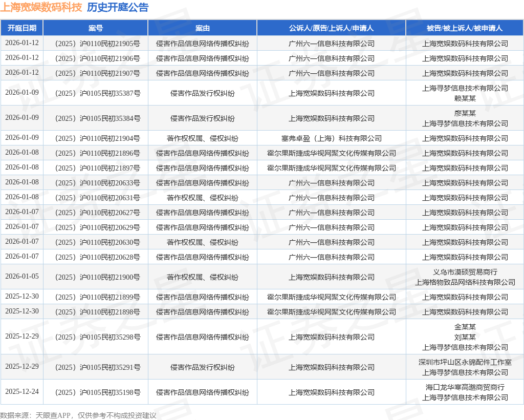 案号:(2025)沪0115民初56634号根据统计,近一年内以上海宽娱数码科技有限公司为当事人的历史开庭公告有769则,其中案由为“侵害作品信息网络传播权纠纷”的公告以414则居首,其次为“著作权权属、侵权纠纷”有162则,“网络侵权责任纠纷”有49则。历史开庭公告(前20条)如下: