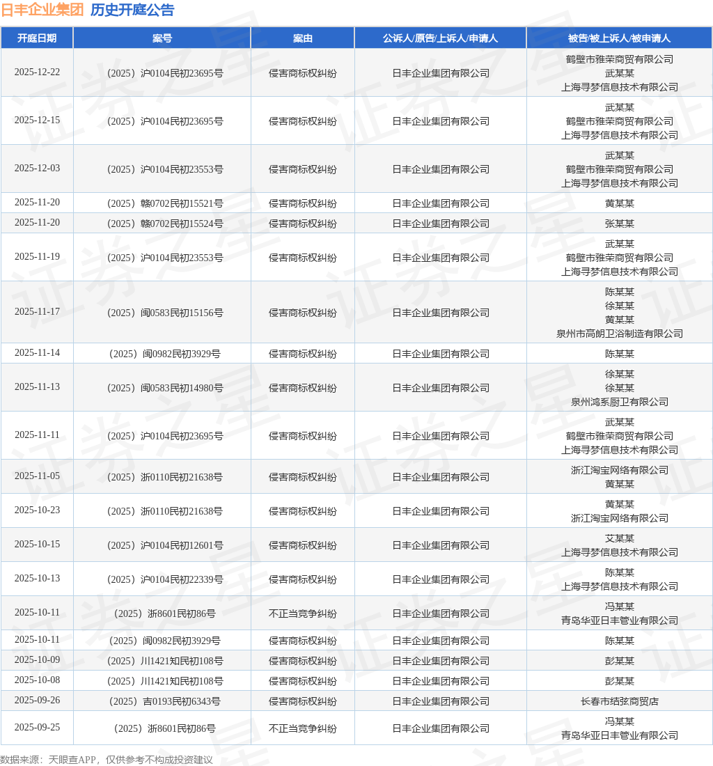 案号:(2025)闽0583民初14980号根据统计,近一年内以日丰企业集团有限公司为当事人的历史开庭公告有105则,其中案由为“侵害商标权纠纷”的公告以88则居首,其次为“不正当竞争纠纷”有5则,“商标权权属、侵权纠纷”有3则。历史开庭公告(前20条)如下: