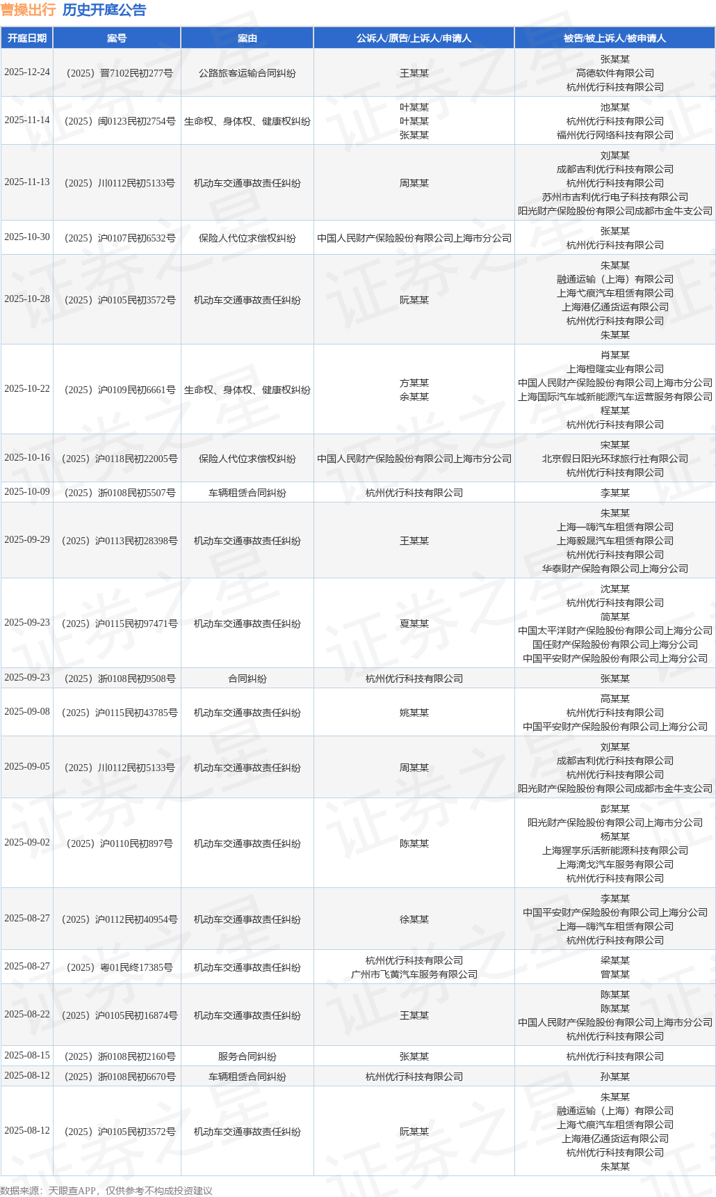 案号:(2025)川0112民初5133号根据统计,近一年内以杭州优行科技有限公司为当事人的历史开庭公告有72则,其中案由为“机动车交通事故责任纠纷”的公告以44则居首,其次为“合同纠纷”有6则,“生命权、身体权、健康权纠纷”有4则。历史开庭公告(前20条)如下: