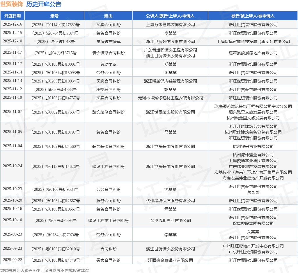 案号:(2025)浙0205民初10034号根据统计,近一年内以浙江世贸装饰股份有限公司为当事人的历史开庭公告有94则,其中案由为“买卖合同纠纷”的公告以16则居首,其次为“装饰装修合同纠纷”有16则,“建设工程施工合同纠纷”有15则。历史开庭公告(前20条)如下: