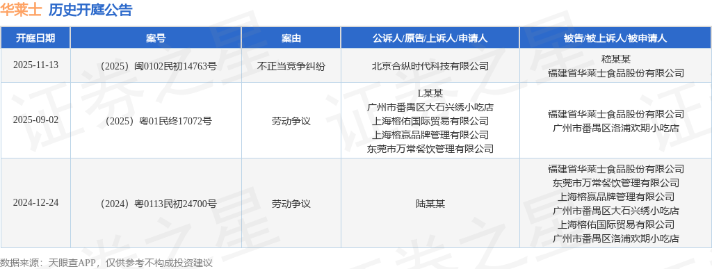 根据统计,近一年内以福建省华莱士食品股份有限公司为当事人的历史开庭公告有3则,其中案由为“劳动争议”的公告以2则居首,其次为“不正当竞争纠纷”有1则。历史开庭公告如下: