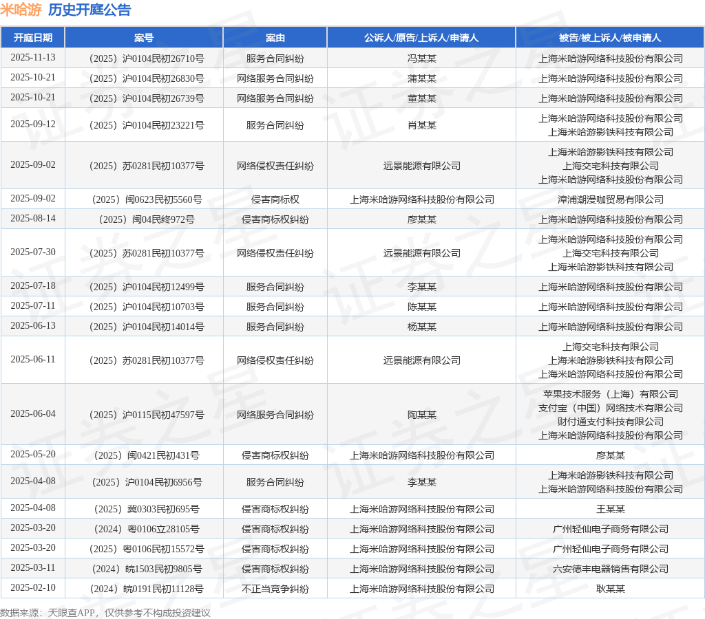 案号:(2025)沪0104民初26710号根据统计,近一年内以上海米哈游网络科技股份有限公司为当事人的历史开庭公告有28则,其中案由为“侵害商标权纠纷”的公告以10则居首,其次为“服务合同纠纷”有6则,“不正当竞争纠纷”有3则。历史开庭公告(前20条)如下: