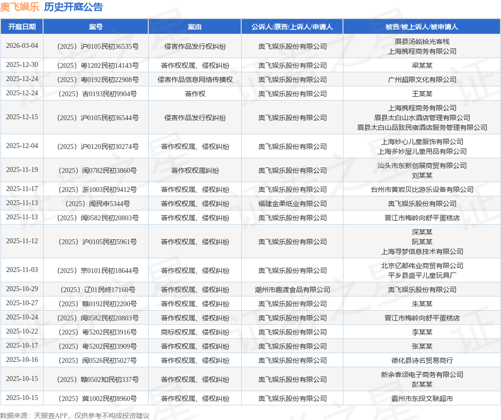 案号:(2025)闽0582民初20803号根据统计,近一年内以奥飞娱乐股份有限公司为当事人的历史开庭公告有428则,其中案由为“著作权权属、侵权纠纷”的公告以218则居首,其次为“侵害作品发行权纠纷”有58则,“侵害作品信息网络传播权纠纷”有29则。历史开庭公告(前20条)如下: