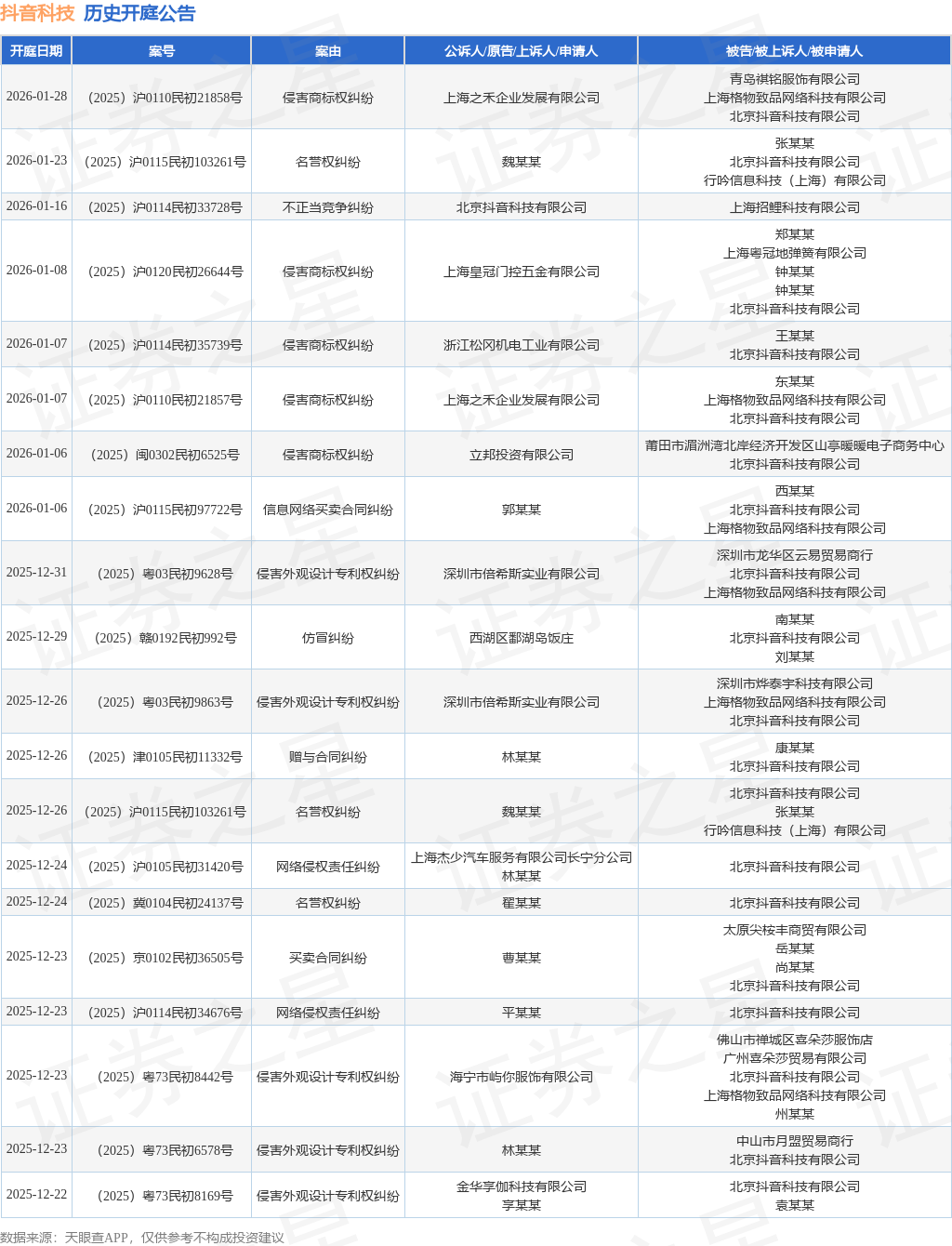案号:(2025)沪0115民初44259号根据统计,近一年内以北京抖音科技有限公司为当事人的历史开庭公告有1639则,其中案由为“侵害外观设计专利权纠纷”的公告以205则居首,其次为“侵害作品信息网络传播权纠纷”有166则,“侵害商标权纠纷”有165则。历史开庭公告(前20条)如下: