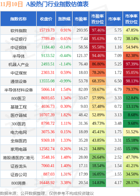 热门行业指数方面,软件指数的市盈率百分位较高,为97.46%。而800消费的市盈率百分位较低,为14.83%。