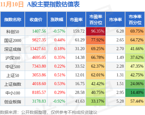 A股主要宽基指数方面,科创50的市盈率百分位较高,为96.35%。而创业板指的市盈率百分位较低,为33.17%。