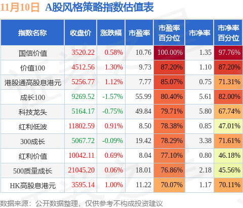 风格策略指数方面,国信价值的市盈率百分位较高,为100.0%。而HK高股息港元的市盈率百分位较低,为70.07%。