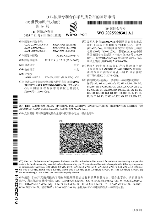 证券之星消息,根据企查查数据显示铂力特(688333)公布了一项国际专利申请,专利名为“增材制造用的铝合金材料及其制备方法、铝合金零件”,专利申请号为PCT/CN2025/091470,国际公布日为2025年11月6日。