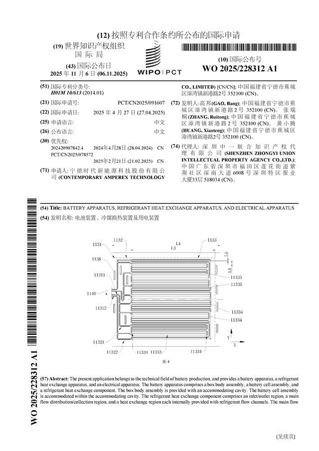 证券之星消息,根据企查查数据显示宁德时代(300750)公布了一项国际专利申请,专利名为“电池装置、冷媒换热装置及用电装置”,专利申请号为PCT/CN2025/091607,国际公布日为2025年11月6日。