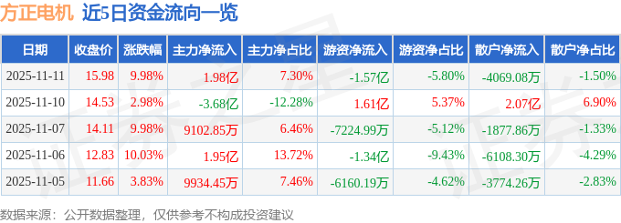 证券之星消息,方正电机11月11日涨停收盘,收盘价15.98元。该股于9点50分涨停,2次打开涨停,截止收盘封单资金为1.18亿元,占其流通市值1.51%。