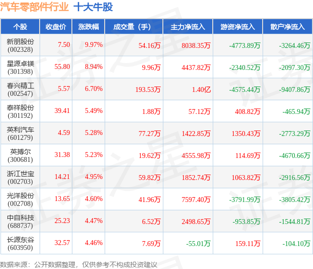 个股表现方面,汽车零部件行业当日领涨股为新朋股份(002328),该股当日报收7.5,上涨9.97%,成交量54.16万,主力资金净流入8038.35万元。星源卓镁(301398)以上涨8.94%紧随其后,该股当日成交量9.96万,主力资金净流入4437.82万元。除此之外,春兴精工(002547)、泰祥股份(301192)、英利汽车(601279)均进入当日牛股之列。具体个股列表见下表: