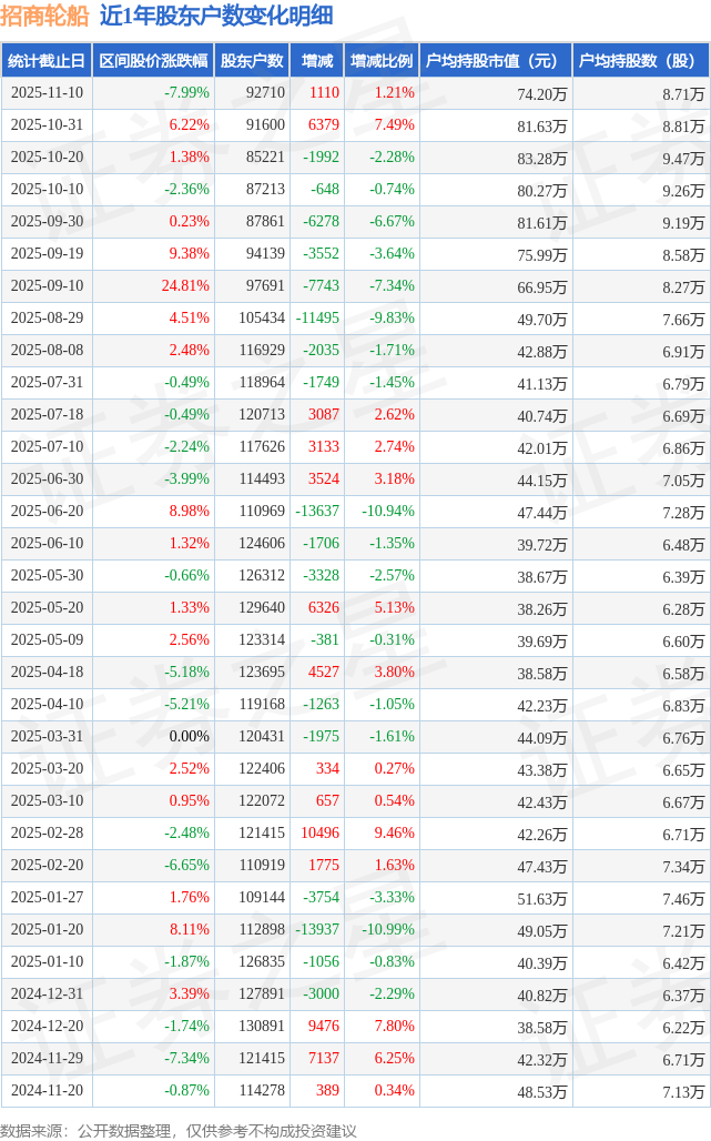 从股价来看,2025年10月31日至2025年11月10日,招商轮船区间跌幅为7.99%,在此期间股东户数增加1110.0户,增幅为1.21%。