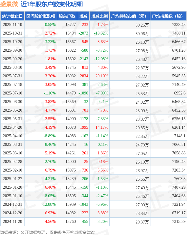从股价来看,2025年10月31日至2025年11月10日,盛景微区间跌幅为0.58%,在此期间股东户数增加233.0户,增幅为1.73%。