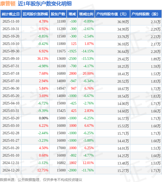 证券之星消息,近日康普顿披露,截至2025年11月10日公司股东户数为1.11万户,较10月31日减少100.0户,减幅为0.89%。户均持股数量由上期的2.29万股增加至2.31万股,户均持股市值为36.99万元。