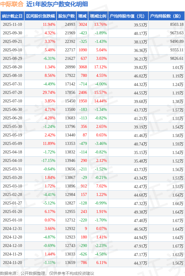 从股价来看,2025年9月30日至2025年11月10日,中际联合区间涨幅为11.94%,在此期间股东户数增加3024.0户,增幅为13.76%。