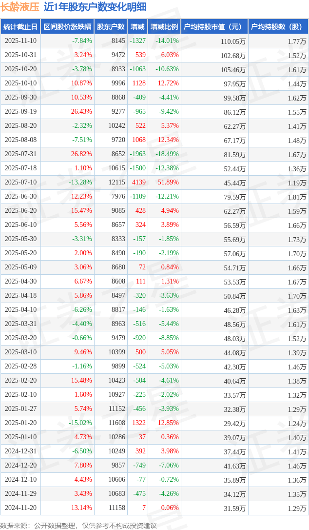 从股价来看,2025年10月31日至2025年11月10日,长龄液压区间跌幅为7.84%,在此期间股东户数减少1327.0户,减幅为14.01%。