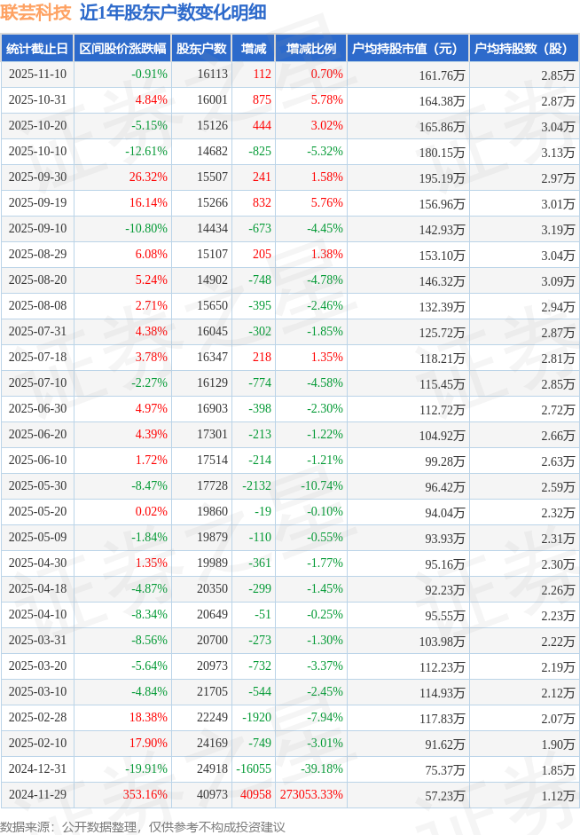 从股价来看,2025年10月31日至2025年11月10日,联芸科技区间跌幅为0.91%,在此期间股东户数增加112.0户,增幅为0.7%。