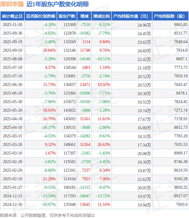 从股价来看,2025年9月30日至2025年11月10日,深圳华强区间跌幅为4.18%,在此期间股东户数减少7510.0户,减幅为6.11%。