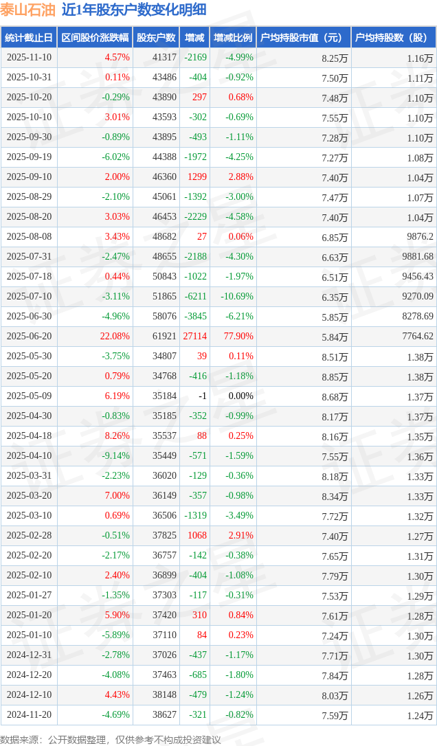 从股价来看,2025年10月31日至2025年11月10日,泰山石油区间涨幅为4.57%,在此期间股东户数减少2169.0户,减幅为4.99%。