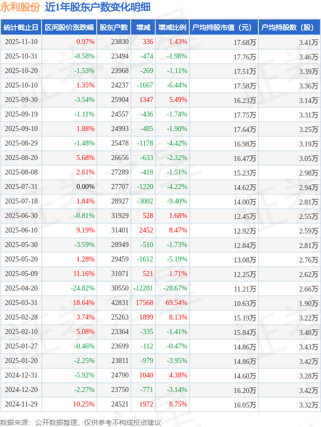 从股价来看,2025年10月31日至2025年11月10日,永利股份区间涨幅为0.97%,在此期间股东户数增加336.0户,增幅为1.43%。