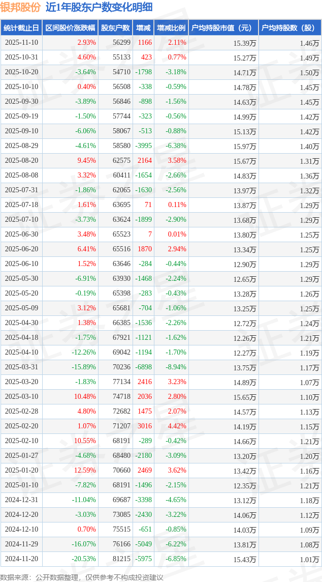 从股价来看,2025年10月31日至2025年11月10日,银邦股份区间涨幅为2.93%,在此期间股东户数增加1166.0户,增幅为2.11%。