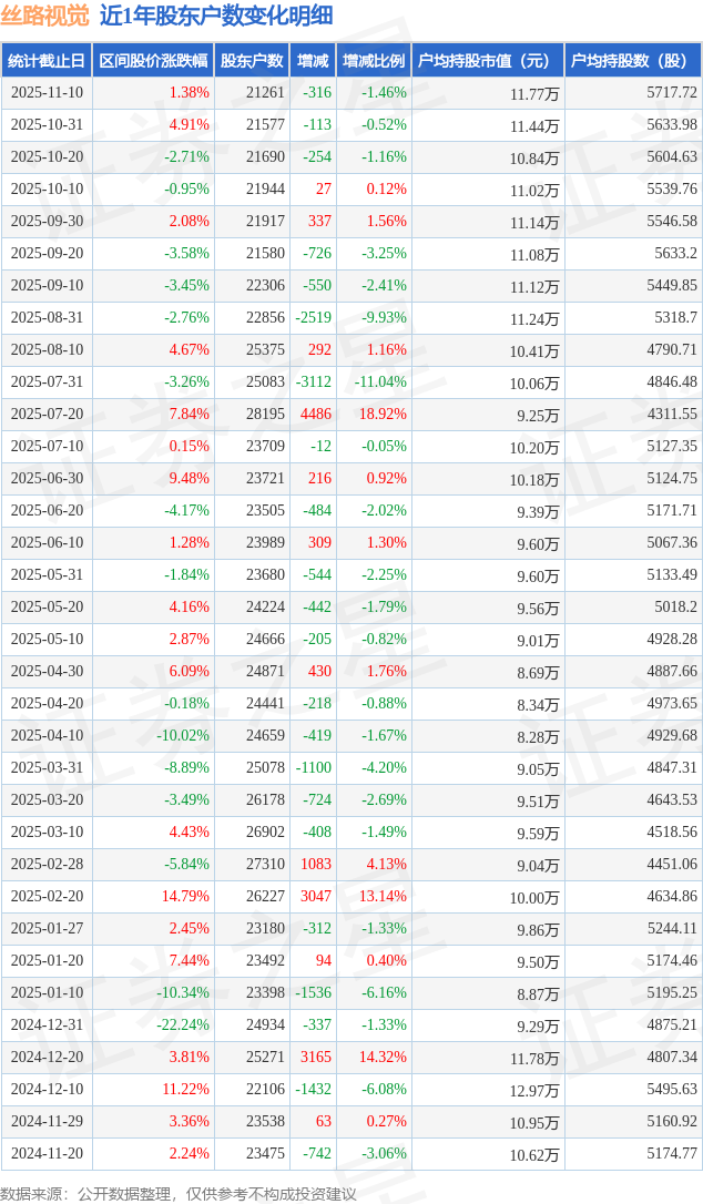 从股价来看,2025年10月31日至2025年11月10日,丝路视觉区间涨幅为1.38%,在此期间股东户数减少316.0户,减幅为1.46%。