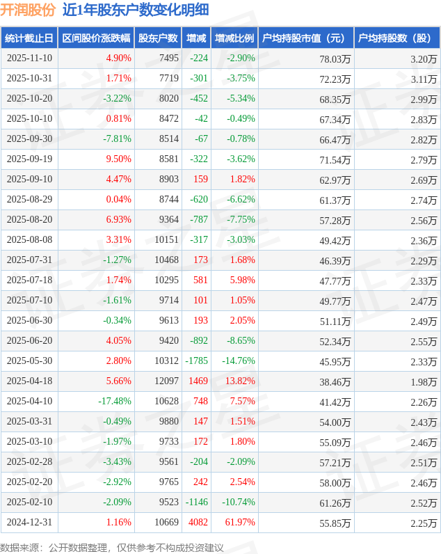 从股价来看,2025年10月31日至2025年11月10日,开润股份区间涨幅为4.9%,在此期间股东户数减少224.0户,减幅为2.9%。