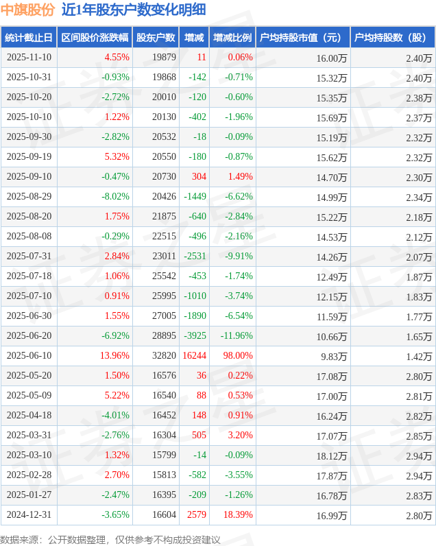 从股价来看,2025年10月31日至2025年11月10日,中旗股份区间涨幅为4.55%,在此期间股东户数增加11.0户,增幅为0.06%。