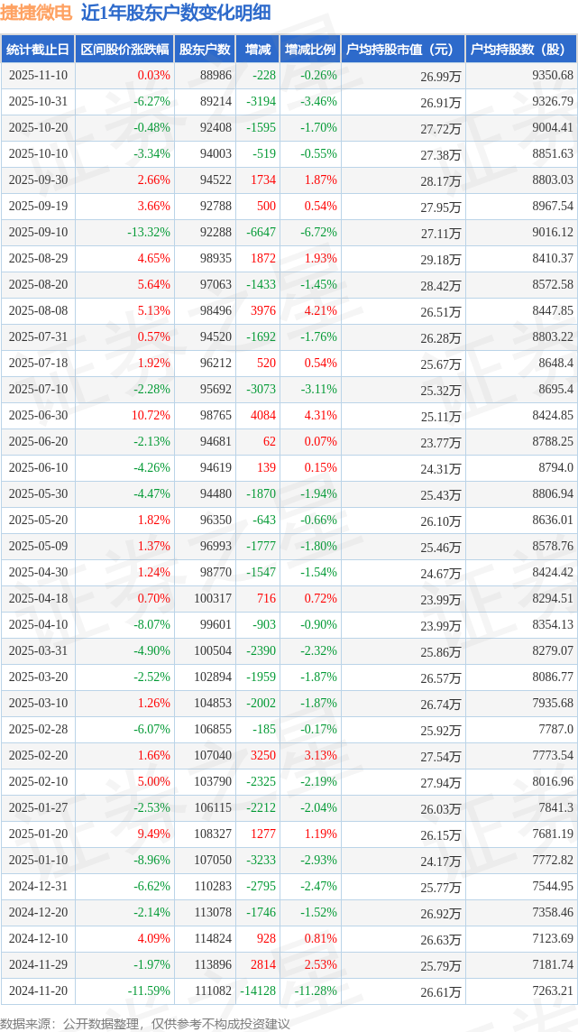 从股价来看,2025年10月31日至2025年11月10日,捷捷微电区间涨幅为0.03%,在此期间股东户数减少228.0户,减幅为0.26%。